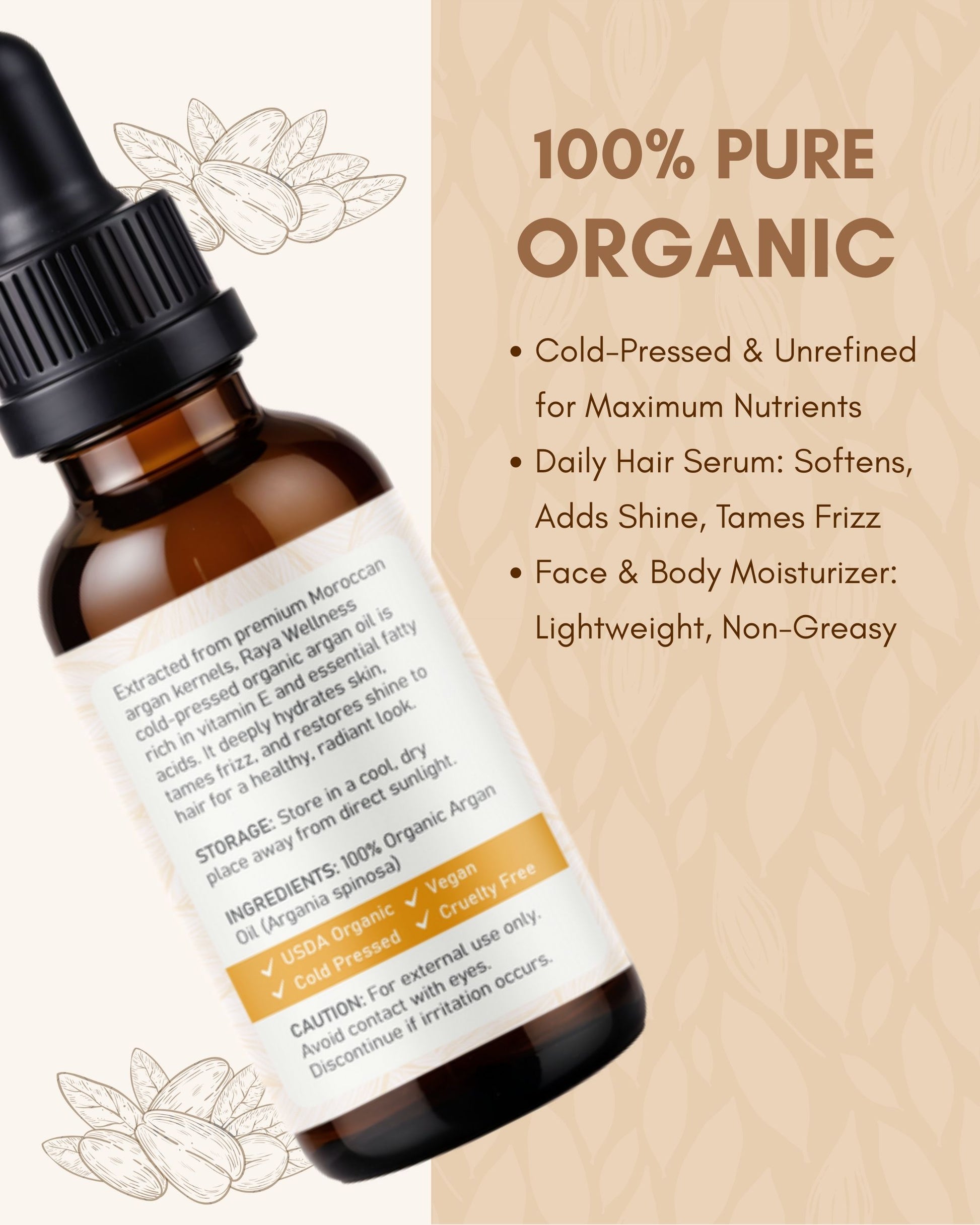 Raya Wellness Organic Argan Oil – 2 fl oz (60 ml) | Cold-Pressed Carrier Oil for Hair & Skin | USDA Organic, Made in USA